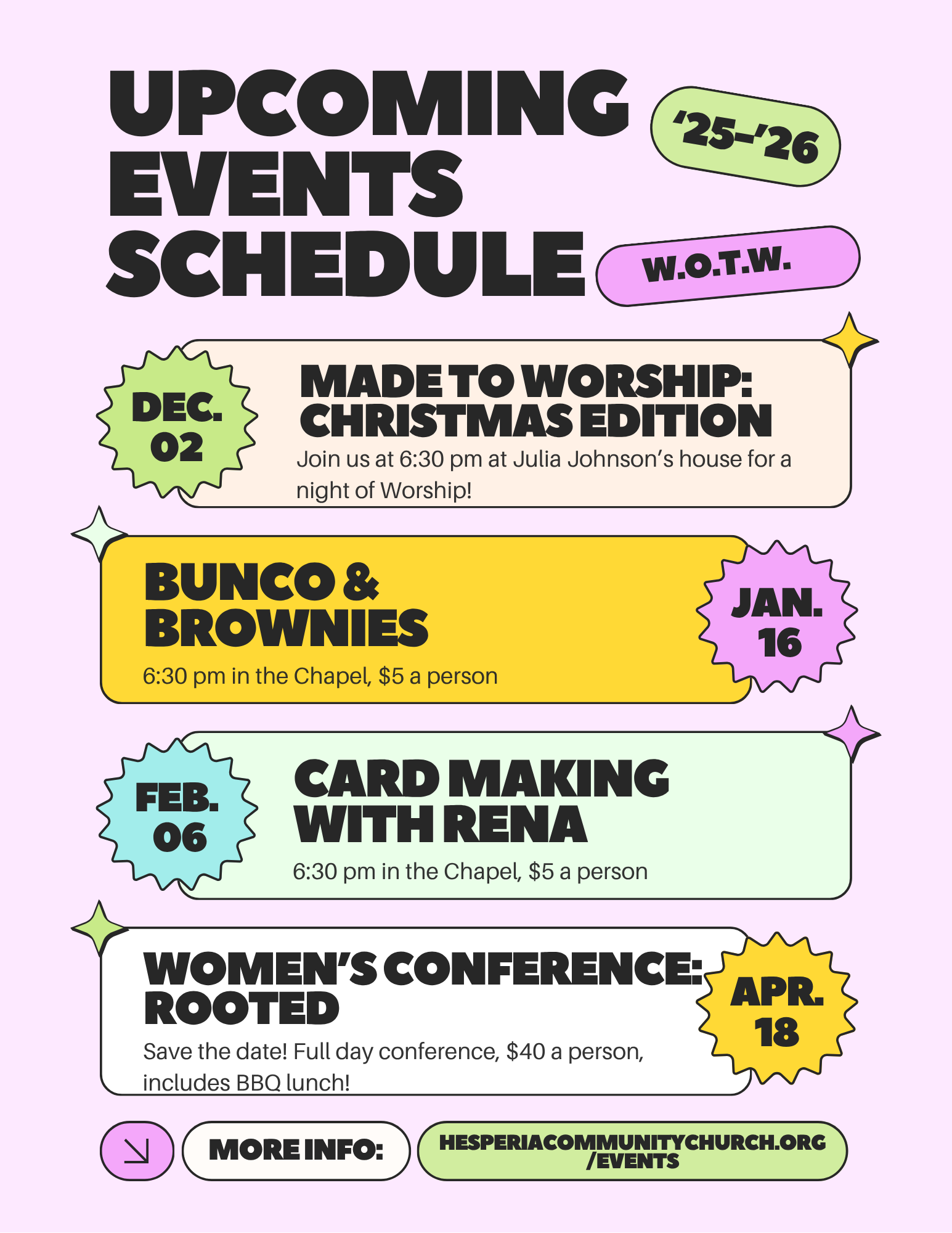 Our Women’s Ministry exists to glorify God through equipping women with Biblical knowledge, encouraging spiritual growth and community through Bible study, planned events, retreats, and conferences.